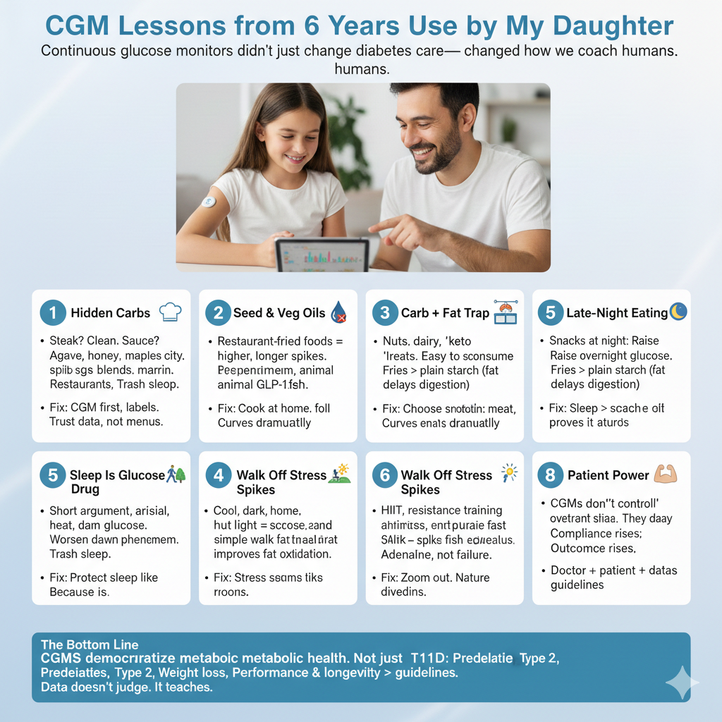 Watching 6+ years of CGM data from my daughter Sheza (Type 1 since age 3) has been a masterclass in real physiology. No theories. No dogma. Just cause → effect → proof.