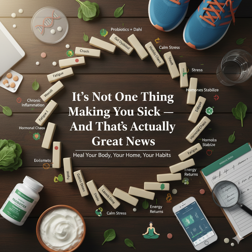 Improve gut + calm stress → inflammation drops → hormones stabilize → energy returns → body lets go of fat.