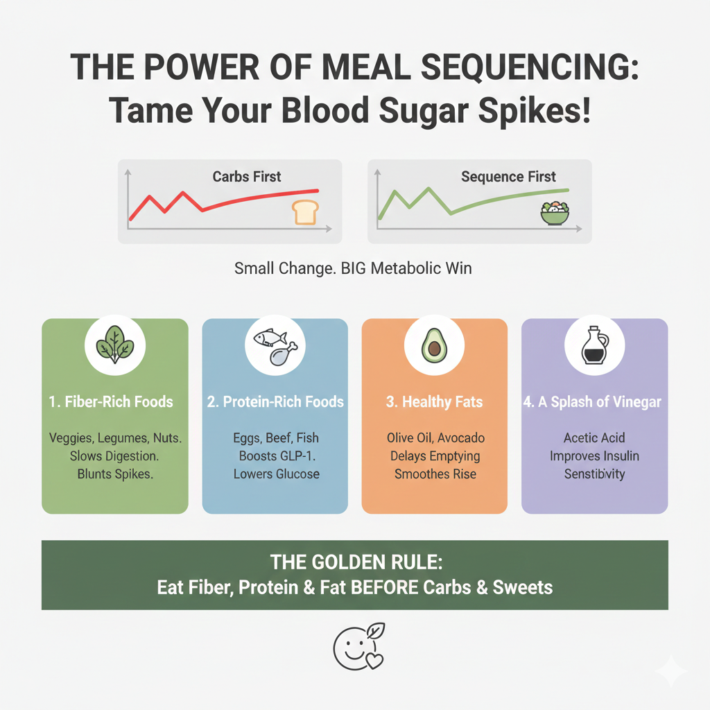 You don’t have to overhaul your diet overnight to see a big metabolic benefit. Simply eat fiber, protein, and healthy fats before carbs and sweets for more stable blood sugar, lower insulin spikes, reduced cravings, and a better shot at long-term metabolic health.
